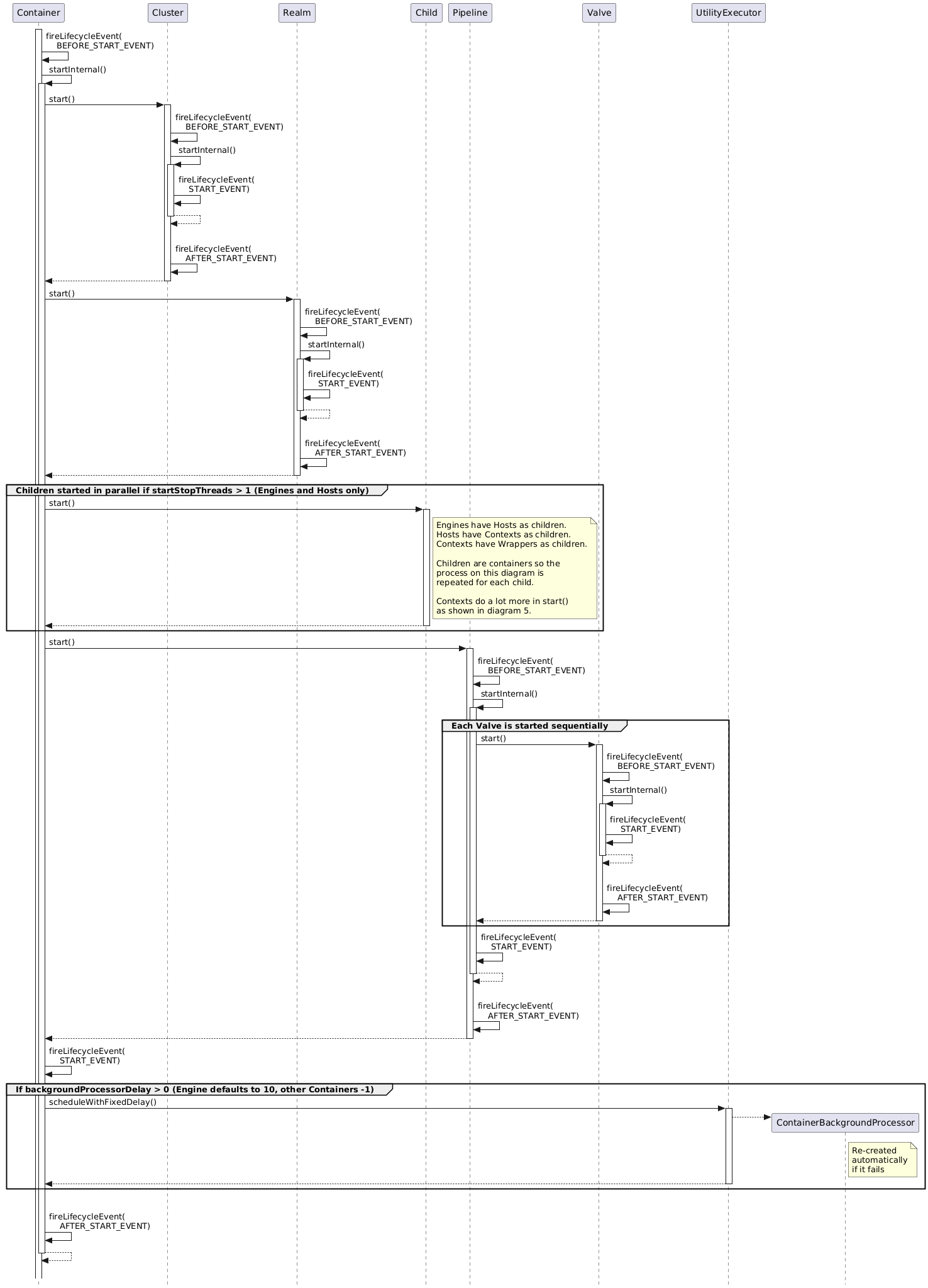 Diagram 3 shows how Tomcat starts the objects created by the Digester that were initialized in the previous step. This diagram also shows when lifecycle events are fired. There is more detail to the starting of the Engine (and other Containers) which is shown in the following diagram.